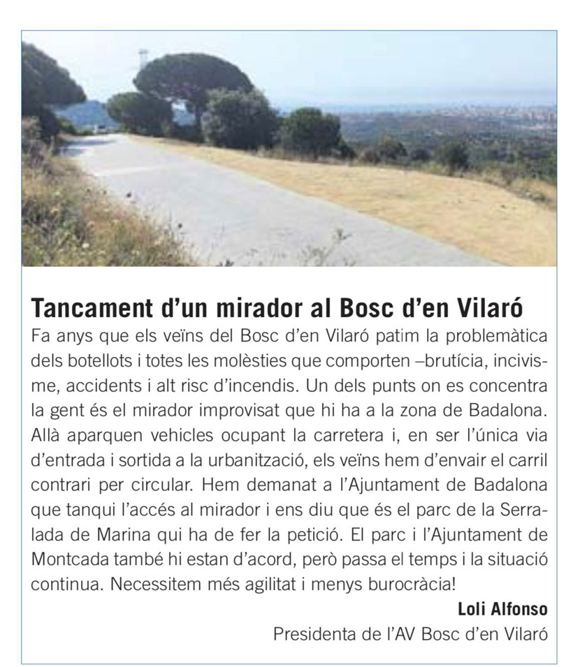 Hace años que los vecinos del Bosc d'en Vilaró sufrimos la problemática de los botellones y todas las molestias que conllevan –suciedad, incivismo, accidentes y alto riesgo de incendios. Uno de los puntos en los que se concentra la gente es el mirador improvisado que hay en la zona de Badalona. Allí aparcan vehículos ocupando la carretera y, al ser la única vía de entrada y salida a la urbanización, los vecinos debemos invadir el carril contrario para circular. nº. 601 1a quincena | julio 2022- pag 15