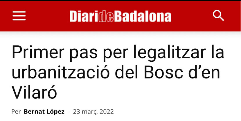 La Comisión de Políticas Digitales y Territorio del Parlamento de Cataluña ha aprobado una propuesta de resolución para regular núcleos de población en situación irregular. La urbanización del Bosc d’en Vilaró, creada en los años 60 y repartida entre Montcada (80%) y Badalona (20%), se puede ver beneficiada. Diari de Badalona Por Bernat López -23 marzo, 2022